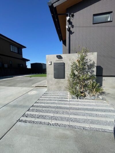 門周りは、300×600角のタイル貼りで重厚感があり、宅配ボックスとポストが一体となった門袖を設置。もちろん、照明も付けています。