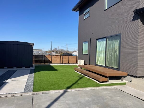 そして、お庭が南にむかって低くなっていましたので、まず土を入れて使いやすいように平らにしました。そして、デッキは腐らずメンテナンスがラクな樹脂デッキに。お庭に出やすいように、デッキ本体と同じ幅のステップも設置しました。人工芝は、燃えにくく芝の目が寝にくい「起立敷」のものにしています。